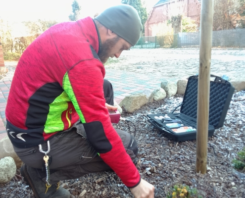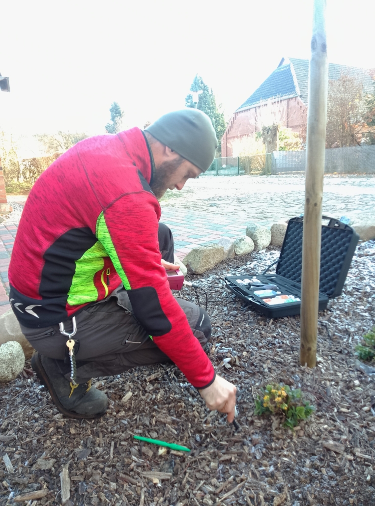 Mit unserer Bodenlanze durchstoßen wir dann die verdichteten Bodenschichten und lockern diese mittels Druckluft auf. Entstandene Hohlräume werden mit Luftkapazitätsbildnern verfüllt, so bekommt der Boden mehr Sauerstoff und Oberflächenwasser kann nachhaltig ablaufen. Je nach Bedarf können Mykorrhizapilze, Wasserspeichergranulate oder andere Bodenhilfsstoffe direkt im Wurzelbereich abgelegt werden und somit schneller von der Pflanze aufgenommen werden und nachhaltiger wirken. Unsere Bodenhilfsstoffe sind frei von Mikroplastik. Das angewendete qualitätsgesicherte Verfahren nach Patent-Nr.: DE 10 2017 125 278 B3 patentiert.